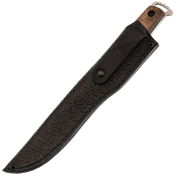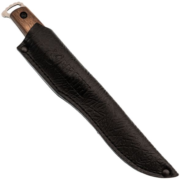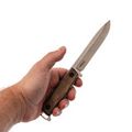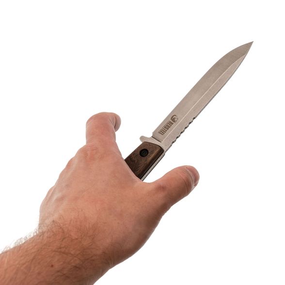 Нож с рукоятью из корня ореха – это не только стильный аксессуар, но и удобный инструмент. Гидрофобная пропитка дерева защищает его от влаги, а подпальцевый упор обеспечивает надежность хвата. Цельнометаллический хвостовик гарантирует прочность и долгий срок службы ножа.