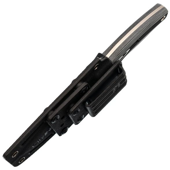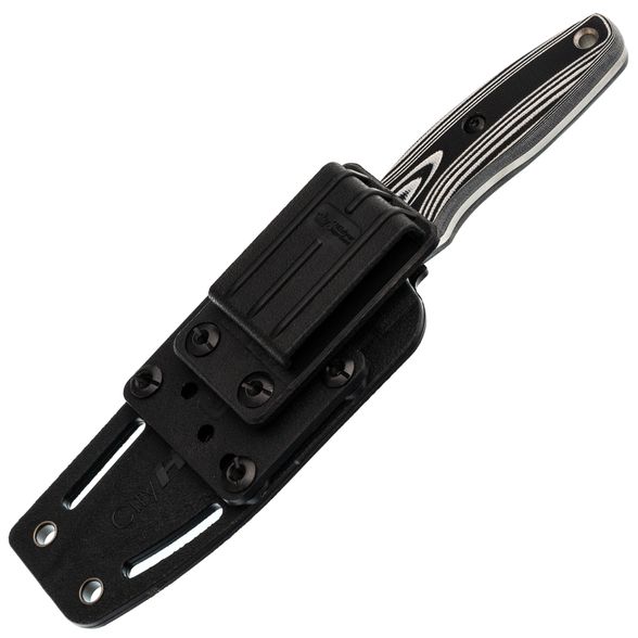 Для надежного хранения и удобного ношения нож комплектуется ножнами из термопластика кайдекс. Этот материал принимает форму ножа, обеспечивая плотную фиксацию, благодаря чему инструмент не выпадает даже при активных движениях. Кайдекс отличается прочностью, влагостойкостью и устойчивостью к механическим повреждениям. Конструкция ножен оснащена прорезями и люверсами, что позволяет крепить их к различным системам переноски. В комплекте идет клипса, обеспечивающая возможность горизонтального или вертикального ношения на ремне.