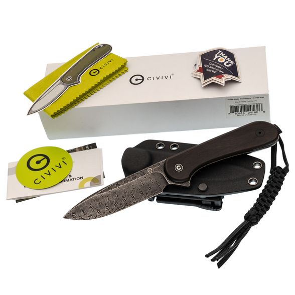 Нож CIVIVI Fixed Blade Elementum Black, сталь дамаск - Добавьте все, что вам нравится в CIVIVI Elementum, и перенесите это на нож с фиксированным лезвием! Он берет любимый Elementum и делает его больше и жестче. А для тех, кто впервые пользуется фиксированным клинком, почему бы не начать со всеми любимого карманного ножа, оснащенного фиксированным клинком? Легкий и эргономичный, этот нож подходит для EDC, охоты, бушкрафта и многого другого! CIVIVI Elementum выпускается в нескольких вариантах, включая классический Elementum liner lock, Elementum Fixed Blade и Elementum button lock. Клинок из инструментальной стали с сатинированной отделкой. Плоские темные накладки рукояти из микарты. Ножны из Kydex с защелкой и клипсой для ремня.