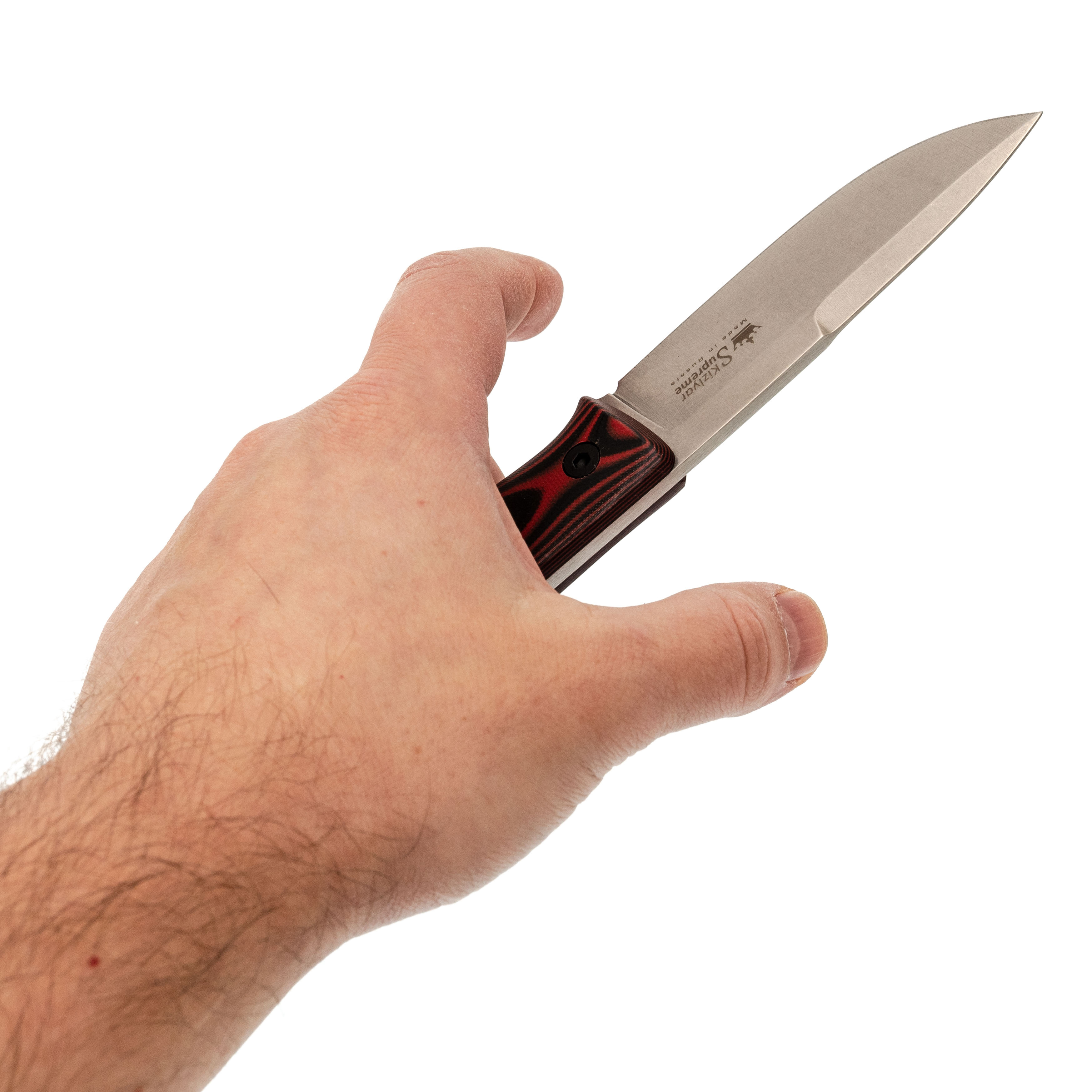 Рукоять сформирована под рабочий хват: плавные линии, без острых граней и навязчивых подпальцевых выемок. Конструкция Full-Tang - цельнометаллический монтаж, когда стальной хвостовик проходит по всей длине рукояти, - добавляет уверенности и ощущения монолита в руке. Накладки из G10 подогнаны аккуратно, не натирают, дают уверенное сцепление и в перчатке, и голой рукой.