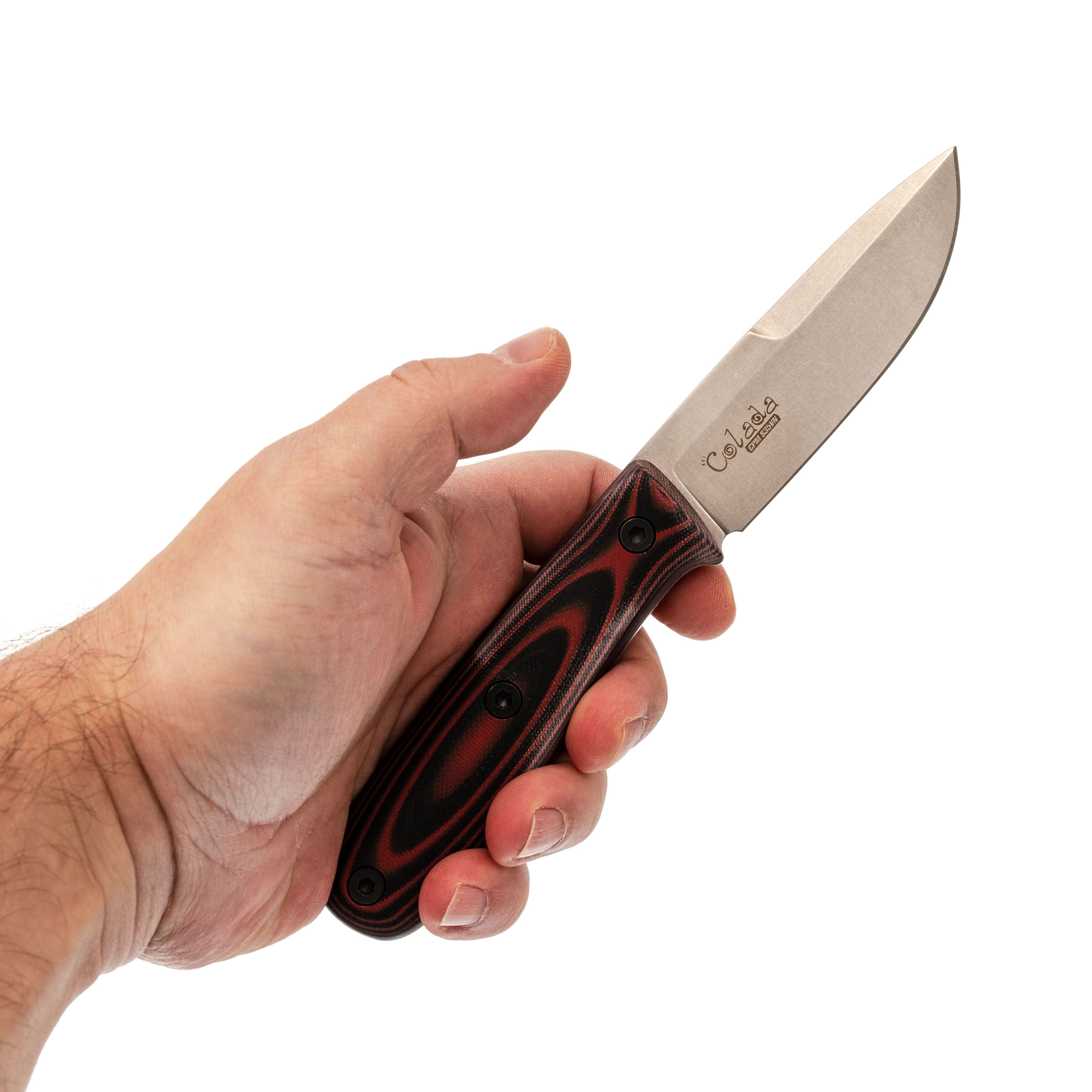 У Colada классический широкий профиль клинка Drop-Point с высокими прямыми спусками. Такая геометрия даёт уверенный рез по продуктам, шнурам, стропам и дереву, при этом кончик остаётся контролируемым и удобным для точных задач. CPM-S35VN позволяет клинку не тупиться после пары выходов - нож спокойно выдерживает плотный туристический день без постоянной правки.