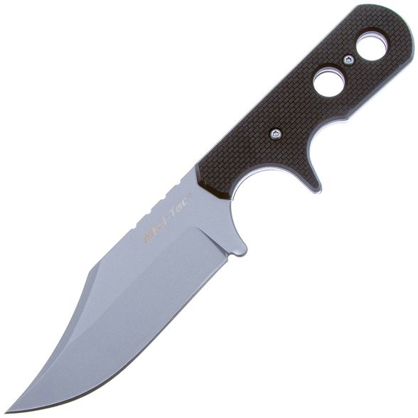 Профиль clip-point центрирует острие относительно рукояти - это даёт предсказуемое поведение на резе и аккуратных проколах. Прямые спуски обеспечивают ровное вхождение в материал, а расширенная насечка на обухе добавляет контроля при прицельной работе. Покрытие делает клинок менее марким и защищает от лишних бликов.