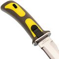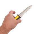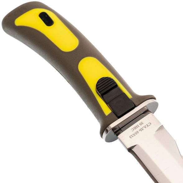 Клинок ножа "Дайвер" изготовлен из высококачественной стали 65Х13, которая обладает отличными коррозионностойкими свойствами, легко поддается заточке и имеет высокую ударную вязкость. Эта сталь идеально подходит для влажной среды, обеспечивая долговечность и надежность клинка. На клинке также имеется стропорез, позволяющий легко разрезать стропы или веревки, а серрейторная заточка расширяет функциональность, делая нож пригодным для разрезания различных материалов под водой.