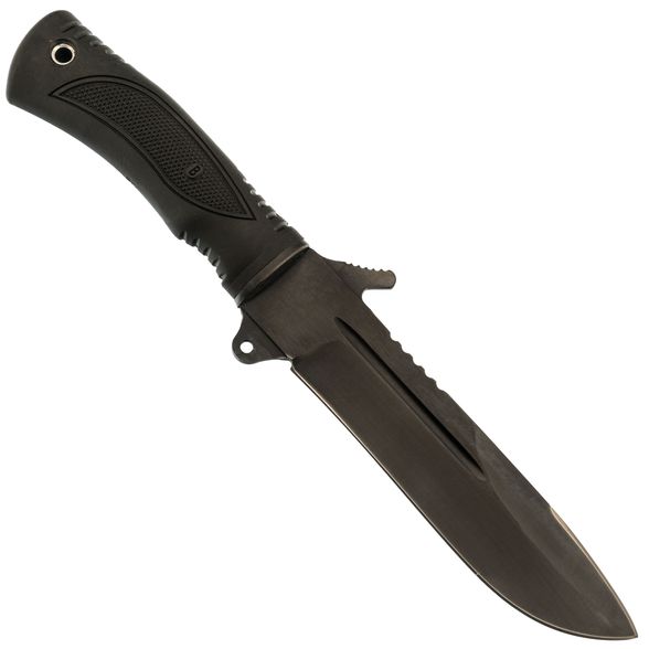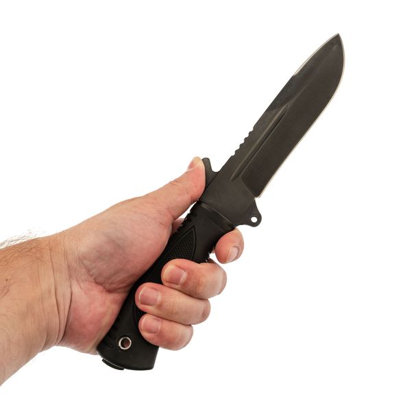 Покрытие: чёрное защитное. Выполняет антикоррозийную функцию, снижает риск бликов на солнце и придаёт клинку тактический внешний вид. Рекомендуется вытирать клинок после намокания для сохранения защитных свойств.