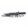 Нож Рэмбо позволит вам быть всегда во всеоружии, куда бы ни направились. Нож содержит в себе несколько интересных решений, о которых нужно сказать отдельно. Первое, - геометрия клинка отлично приспособлена для реза и для нанесения рубящих ударов. Второе, - на обухе расположена острая пила. Третье - в рукояти находится НАЗ (носимый аварийный запас). НАЗ помещен в герметичный пластиковый контейнер, в котором находятся спички, лейкопластырь и леска с рыболовным крючком. Форма гарды позволяет использовать ее как отвертку с прямым и крестовым шлицем.