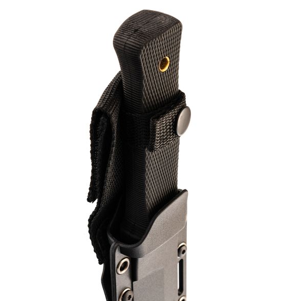 Рукоять ножа выполнена из высокопрочного композитного титана G10, который является сочетанием легкости и прочности. Инструмент удобно держать в руке, а его текстурированная поверхность предотвращает скольжение во влажных условиях. Это важно для тех, кто использует нож в полевых условиях или при повышенной влажности.
