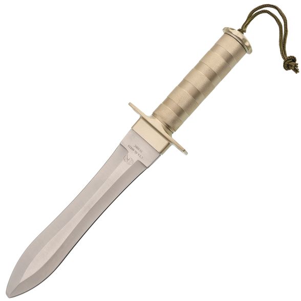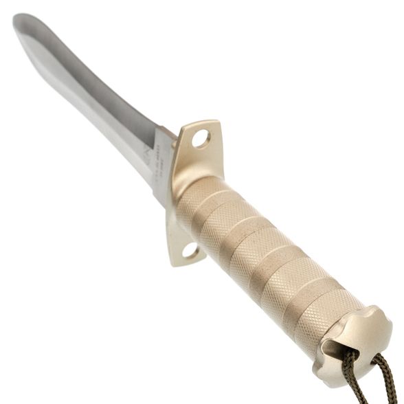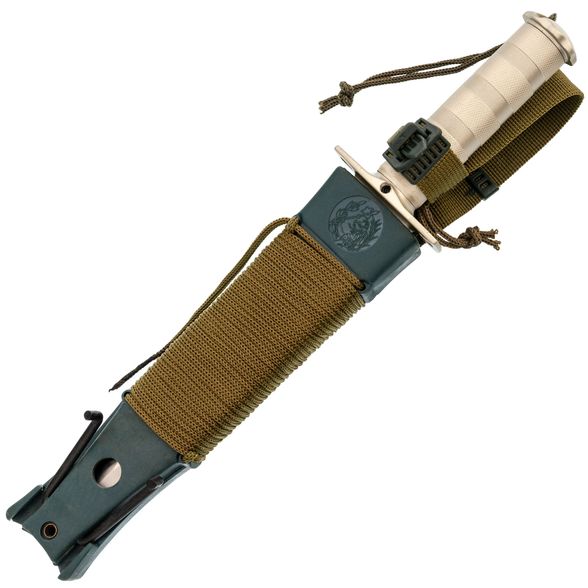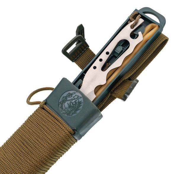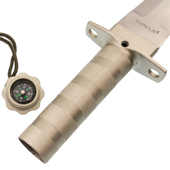Цельнометаллическое исполнение обеспечивает высокую прочность. Внутри рукояти предусмотрено герметичное отделение с аварийным комплектом: спички, леска с крючком, иголка и нитки. -