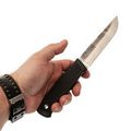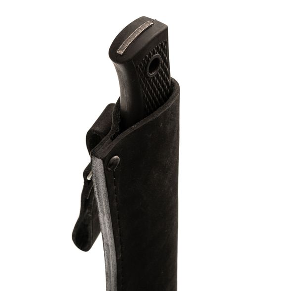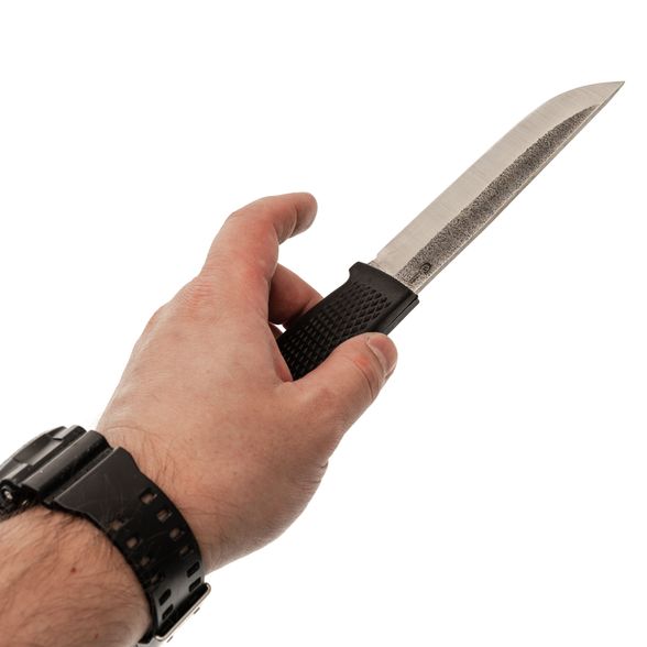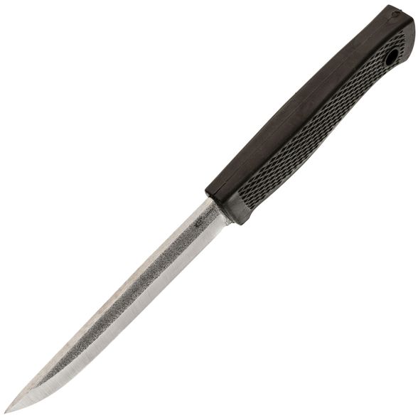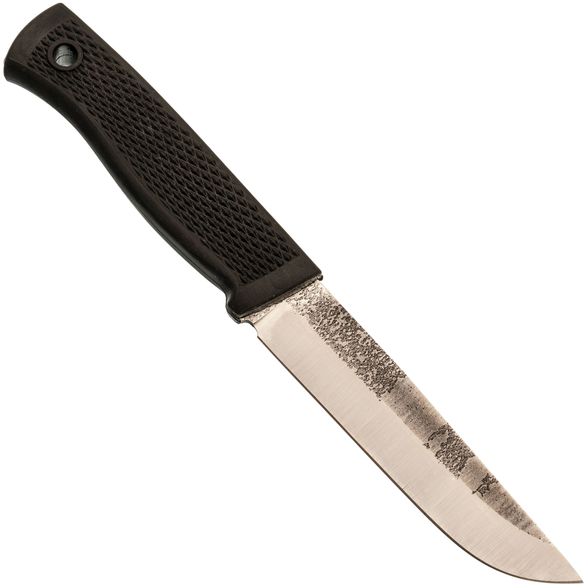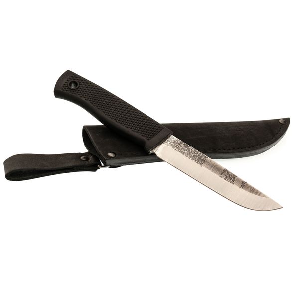 Рукоять ножа изготовлена из эластрона - современного резиноподобного материала, устойчивого к воздействию воды и экстремальных температур. Текстура рукояти цепкая, что обеспечивает надежное и комфортное удержание, даже в неблагоприятных условиях.
