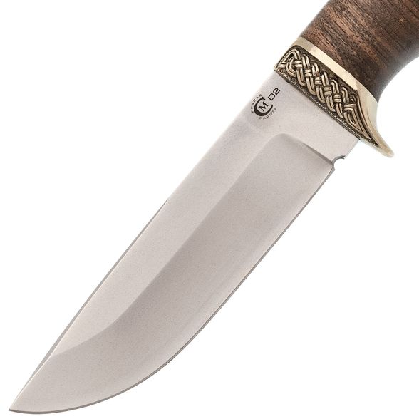 Клинок изготовлен из инструментальной стали D2, известной своей способностью долго удерживать заточку, что особенно важно для охотничьих и туристических ножей. Для улучшения коррозионной стойкости клинок подвергли травлению. Спуски, выполненные на 2/3 длины, обеспечивают оптимальный баланс между прочностью и остротой режущей кромки. Такой клинок готов справиться с различными задачами на природе.