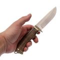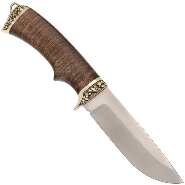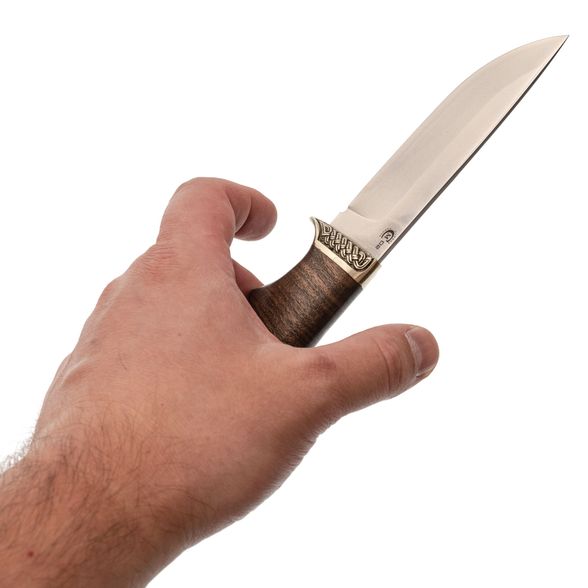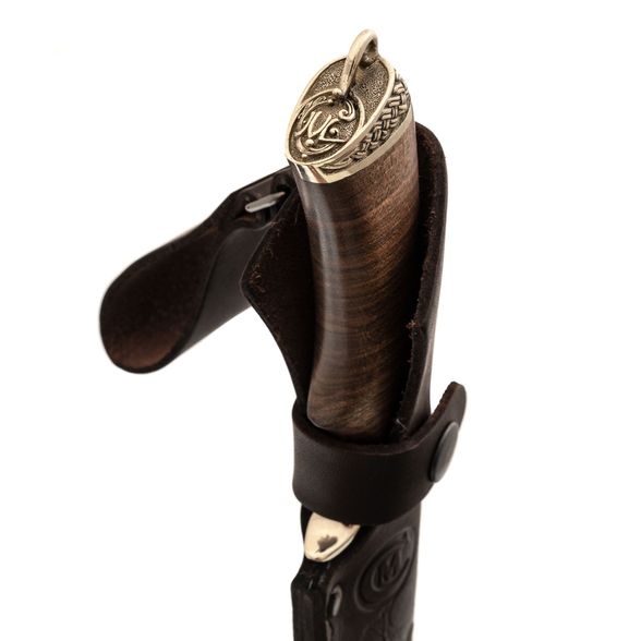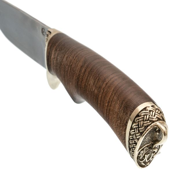 Рукоять изготовлена из капа ореха, который отличается повышенной прочностью по сравнению с обычной древесиной, но при этом имеет больший вес. Это обеспечивает надежный хват и долговечность. Навершие и больстер выполнены из мельхиора с художественным литьём, что придаёт ножу эстетичный и уникальный вид.