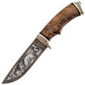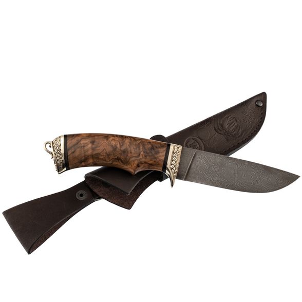 Сияющий клинок, выкованный из дамасской стали, словно хранит в себе тайны древних времен. На нем изящно выгравирована картина битвы могучих зверей, будто оживает под лучами света. Однако это не только произведение искусства – Егерь обладает еще и функциональной геометрией клинка. Спуски от обуха придают ножу отличные режущие характеристики, делая его не только прекрасным украшением, но и эффективным инструментом в руках опытного охотника или коллекционера. Величественный вид сочетается с практичностью – что может быть лучше для настоящего ценителя?