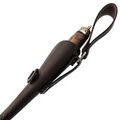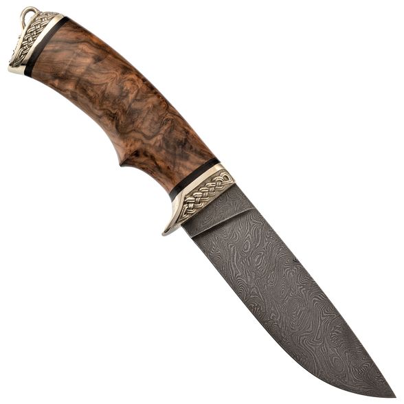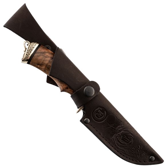 Рукоять выполнена с лёгким изгибом и имеет подпальцевую выемку: это обеспечивает надёжный хват в любых условиях. Она изготовлена из орехового дерева, навершие и больстер отлиты из мельхиора и украшены орнаментом, напоминающим скифские и славянские обережные узоры. На тыльнике имеется петля, через которую можно продеть темляк.