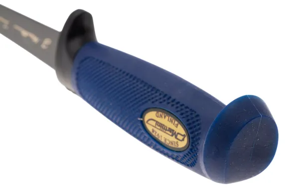Фирменная рукоять Marttiini спроектирована так, чтобы нож уверенно сидел в руке даже при работе у воды или у мойки. Небольшой изгиб повторяет линию ладони, а расширение к тыльной части добавляет контроля при тяговых движениях. Текстура резины даёт ощущение "прилипания" к пальцам без дискомфорта и не натирает кожу. В результате нож меньше стремится провернуться или выскользнуть, а рука устаёт заметно меньше.