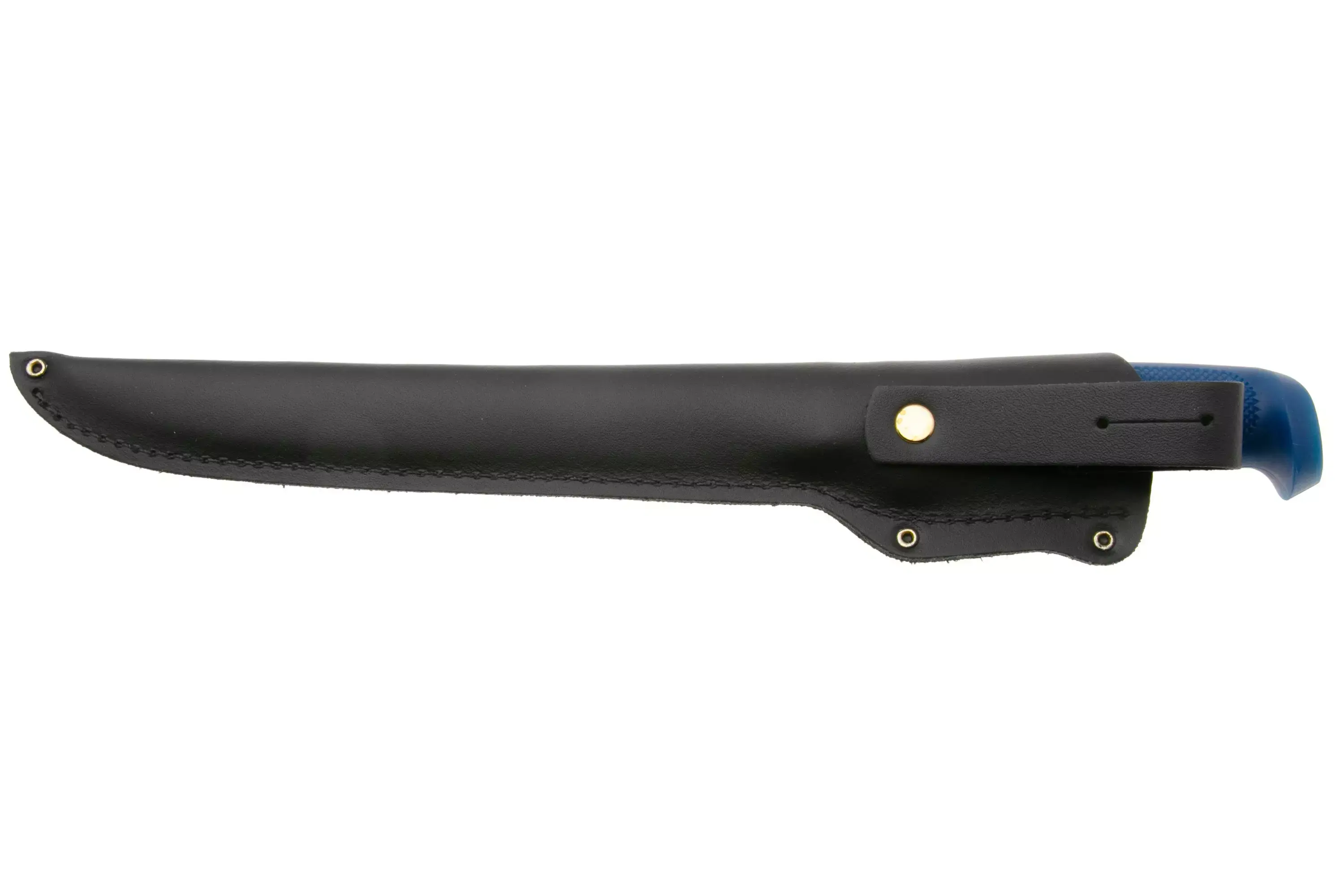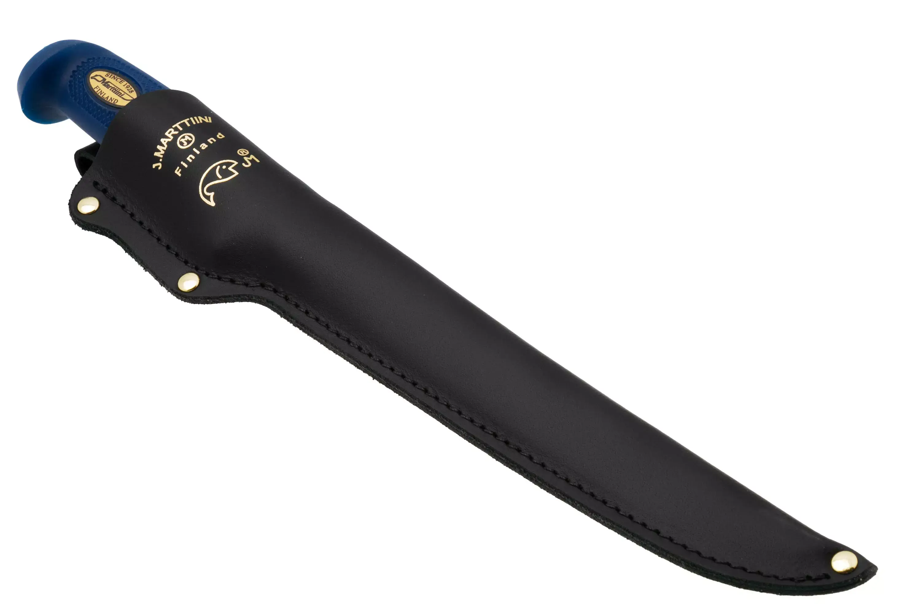 Martef комплектуется классическими чёрными кожаными ножнами с логотипом Marttiini. Кожа хорошо держит форму, защищает клинок от внешних воздействий и не боится регулярного использования. Ножны удобно носить на поясе, а при хранении они закрывают режущую кромку и убирают лишнюю влагу с лезвия. Это практичный вариант для тех, кто берёт филейник и на природу, и на домашнюю кухню.