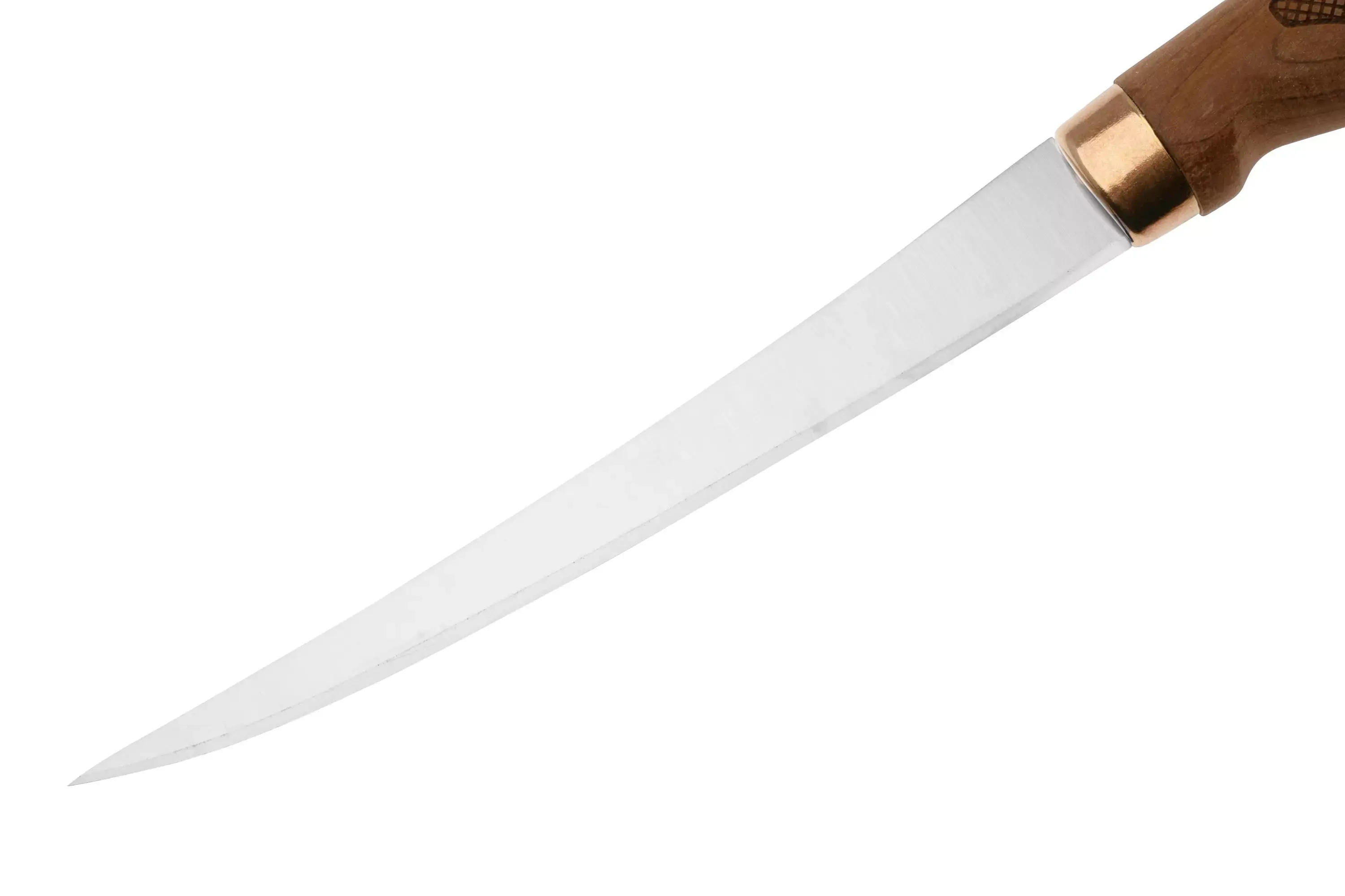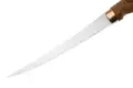 Клинок длиной 19 см и толщиной около 1,3 мм - тонкий, узкий и очень податливый. Такая геометрия позволяет буквально "обнимать" кость и кожу, снимая филе максимально чисто и аккуратно. Дополнительная гибкость даёт отличный контроль: клинок следует за движением руки, а не наоборот. Общая длина ножа 31 см обеспечивает удобный рычаг при работе с рыбой среднего размера и мягкими продуктами.