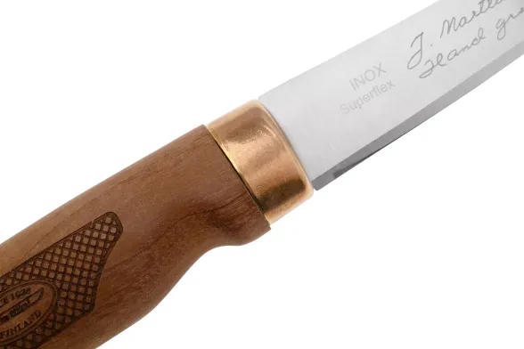 SUPERFLEX идёт в фирменных ножнах Marttiini из износостойкого материала. Чехол закрывает клинок полностью, защищая и сталь, и окружение при переноске. Его удобно брать с собой на рыбалку или дачу: нож надёжно фиксируется внутри, а отверстия для проветривания помогают быстрее выводить влагу после работы.