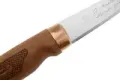 Тёмная берёза на рукояти даёт тёплое, "живое" ощущение в руке - с этим ножом приятно проводить много времени за разделкой. Форму рукояти сделаны так, чтобы пальцы сами находили упор, а хват оставался надёжным даже мокрыми руками. Баланс смещён к клинку, что облегчает длинные, протяжённые резы при филировке.