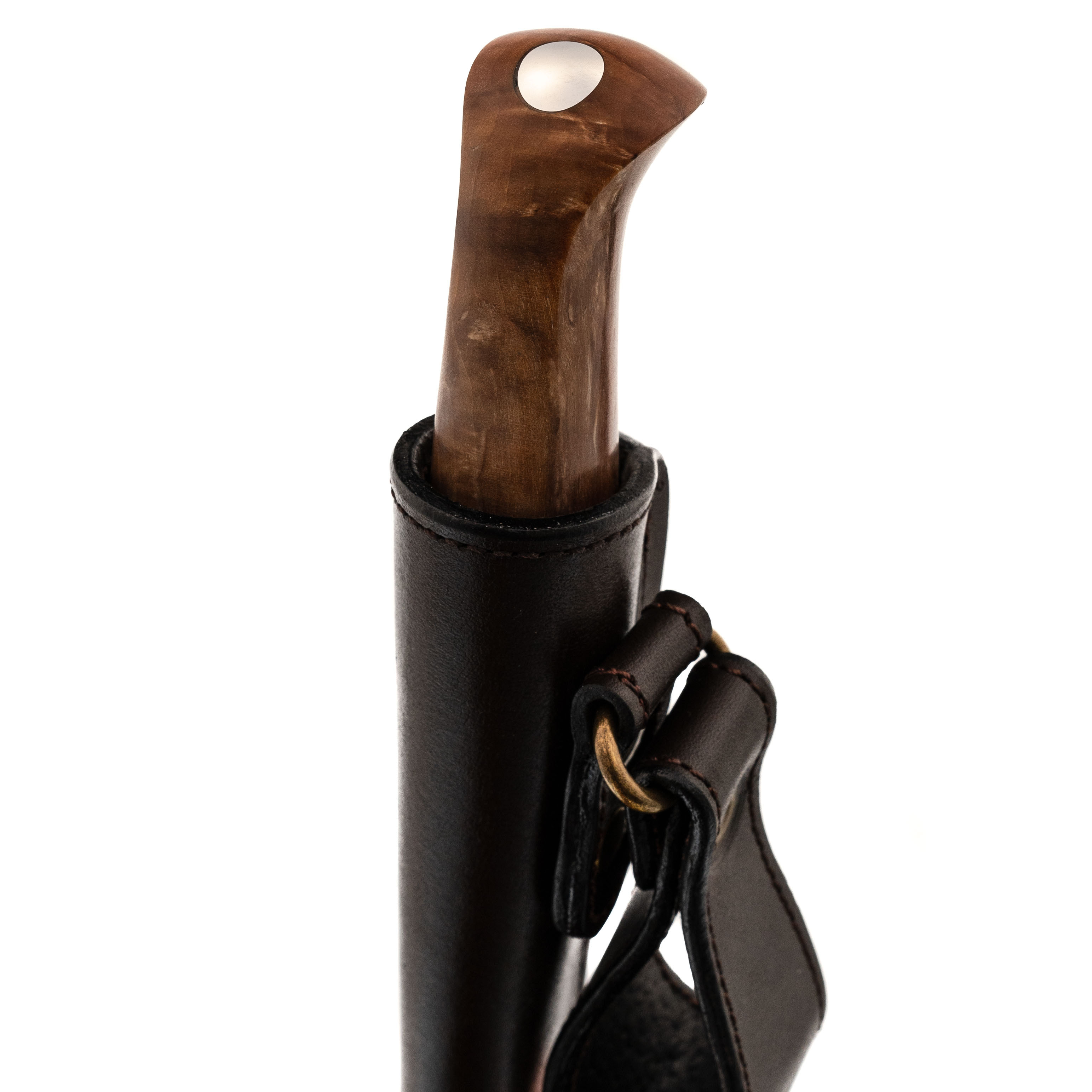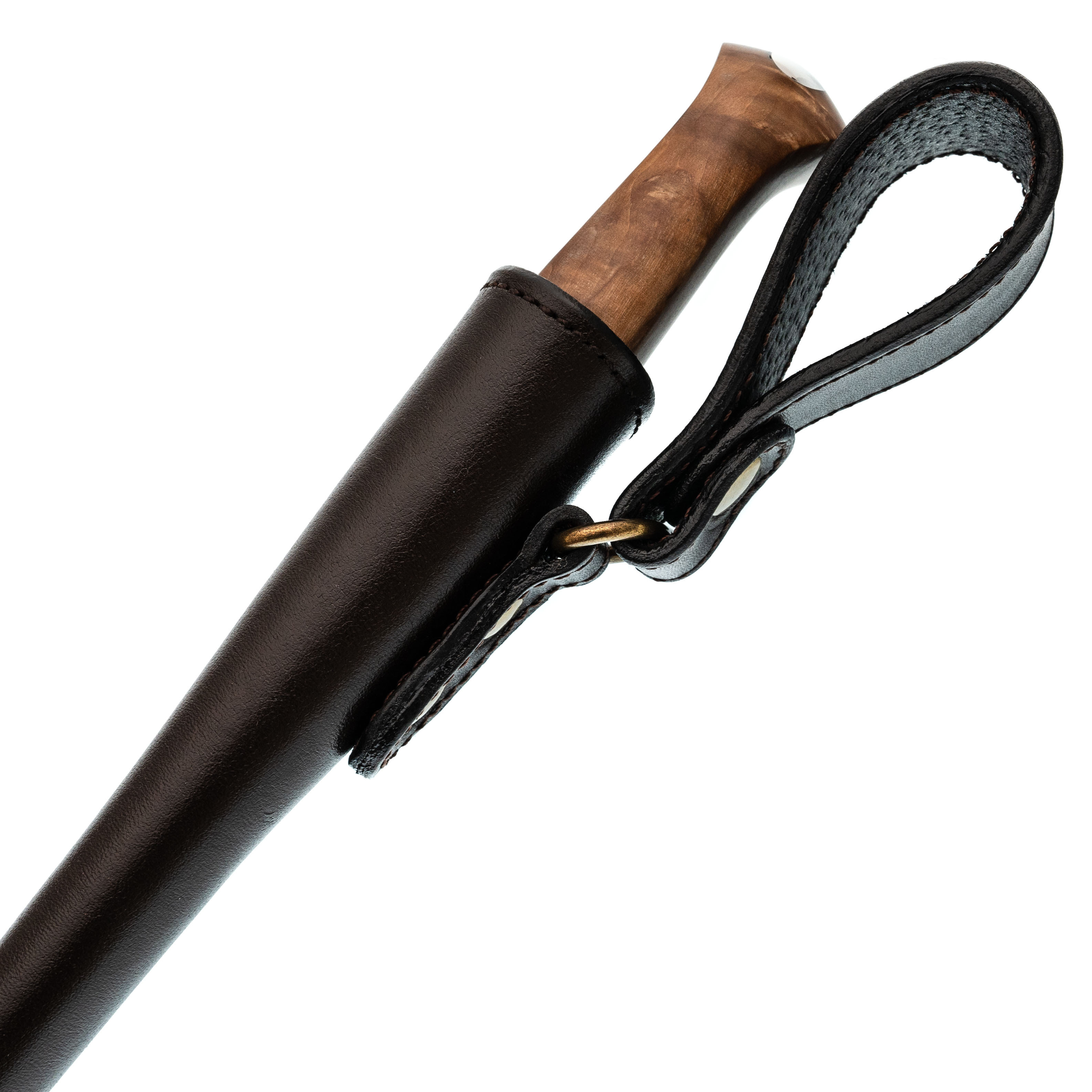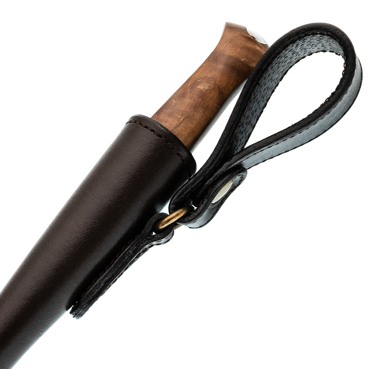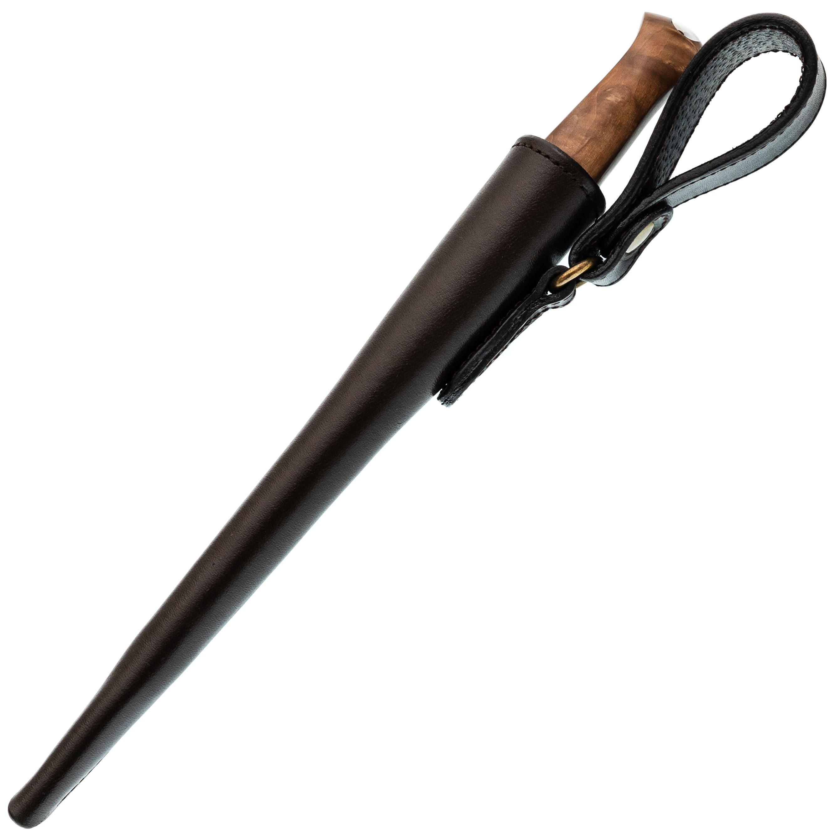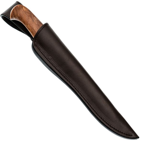Ножны из натуральной кожи надёжно фиксируют инструмент внутри, не давая ему выскользнуть при движении. Погружная конструкция защищает клинок, а свободный подвес делает ношение максимально удобным - можно идти, приседать, подниматься по склону, и ничего не мешает.
