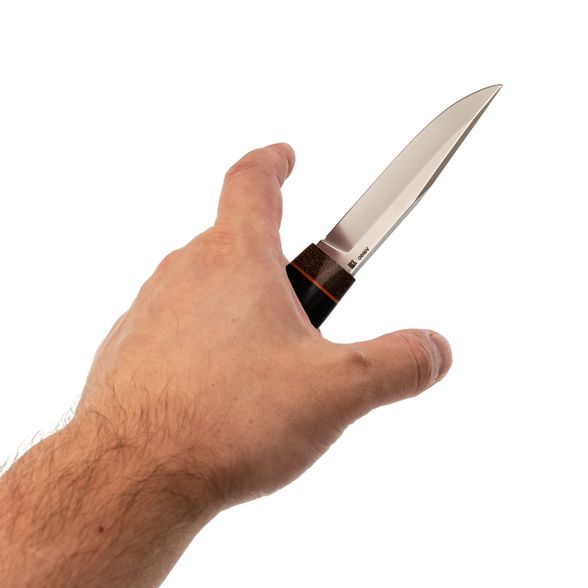 Профиль Drop-Point даёт понятную геометрию на каждый день: продукты, шнуры, лёгкие работы по дереву. Вогнутые спуски от середины обеспечивают липкий рез без излишней тонкости - хороший компромисс между прочностью и остротой. Управляемый кончик помогает при точных подрезах и аккуратной работе.