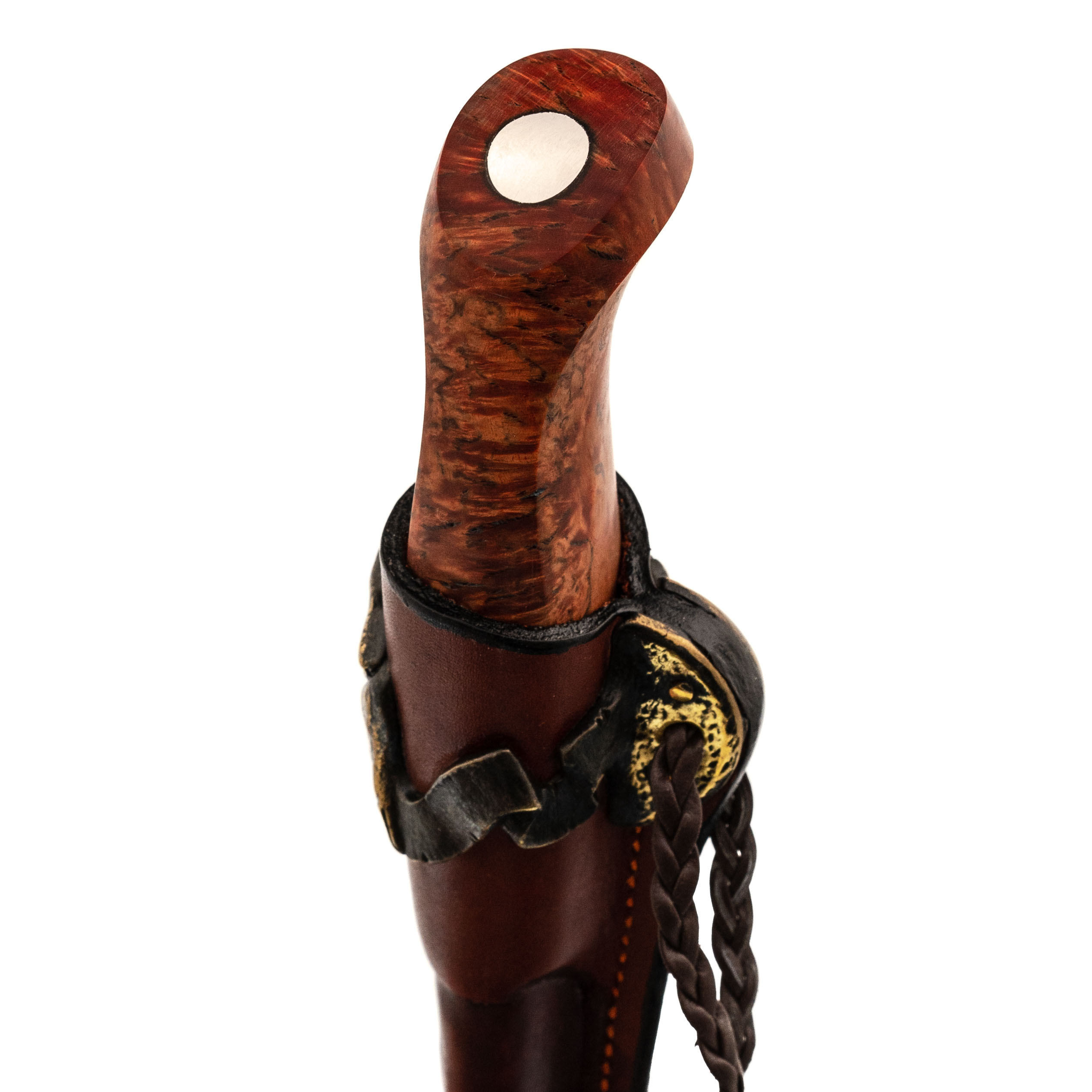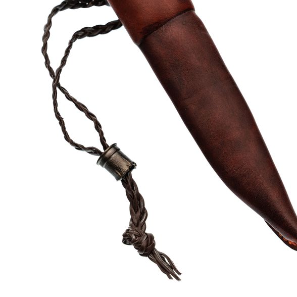 Ножны: натуральная кожа. Плотная, хорошо держит форму, защищает клинок и одежду.