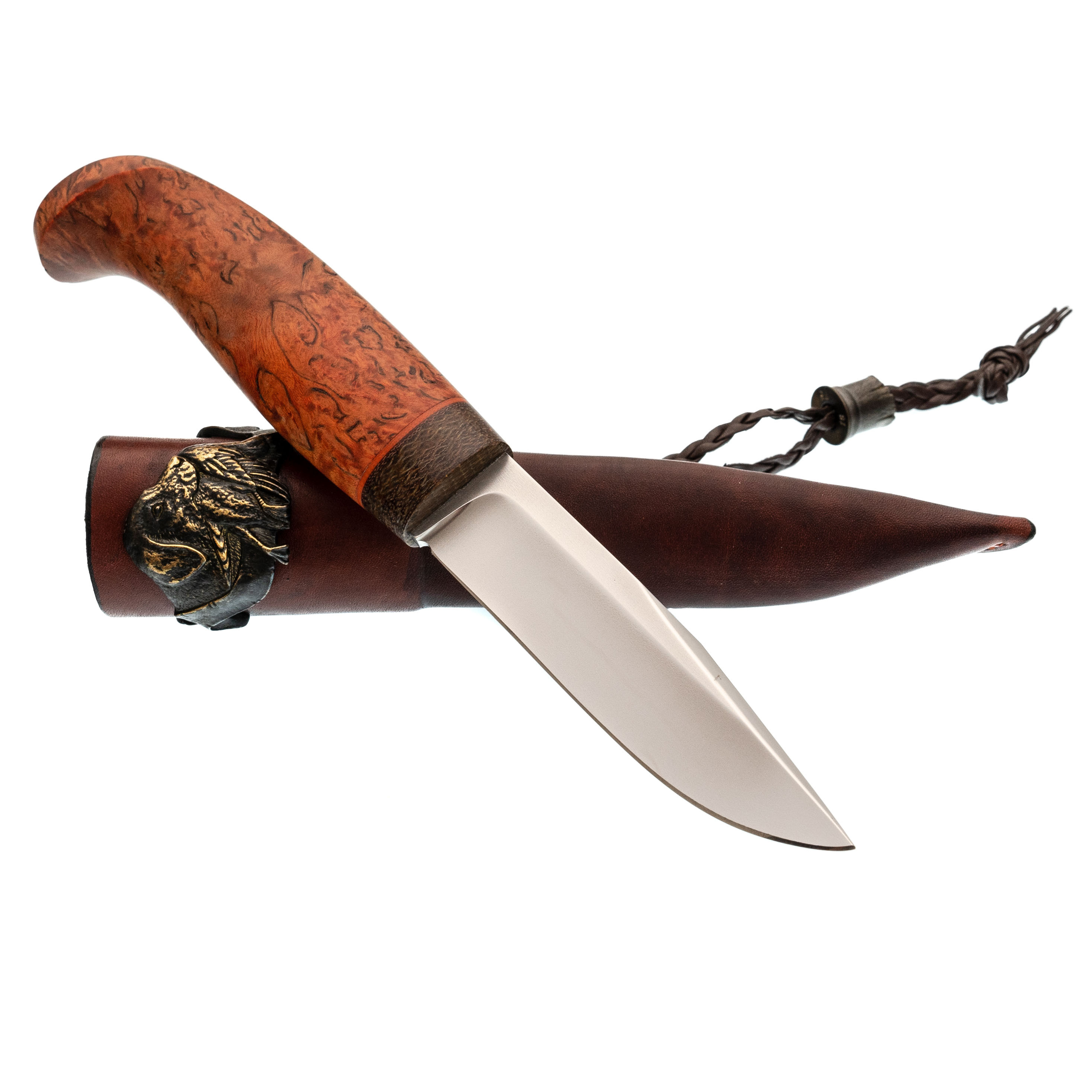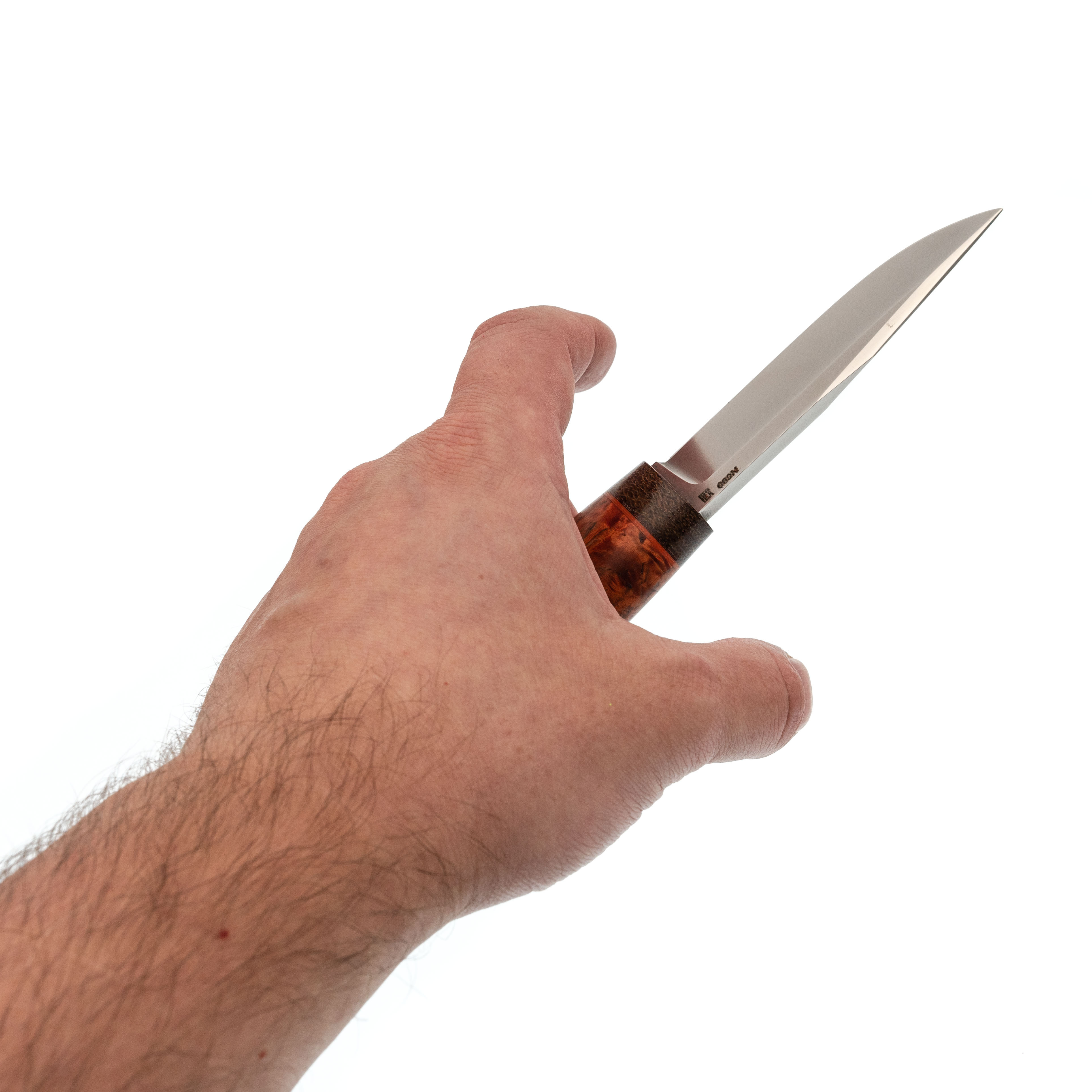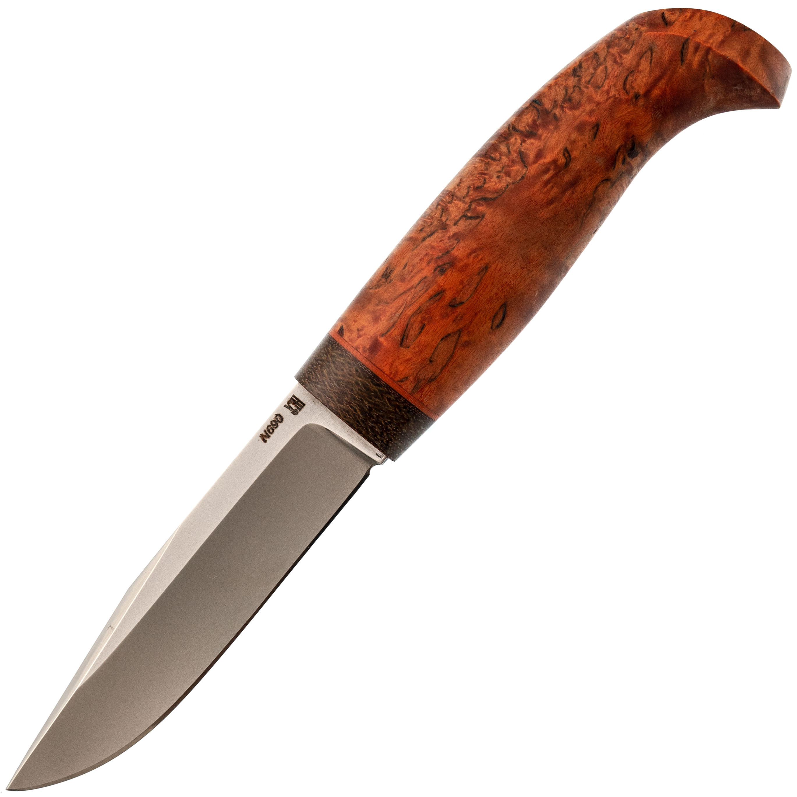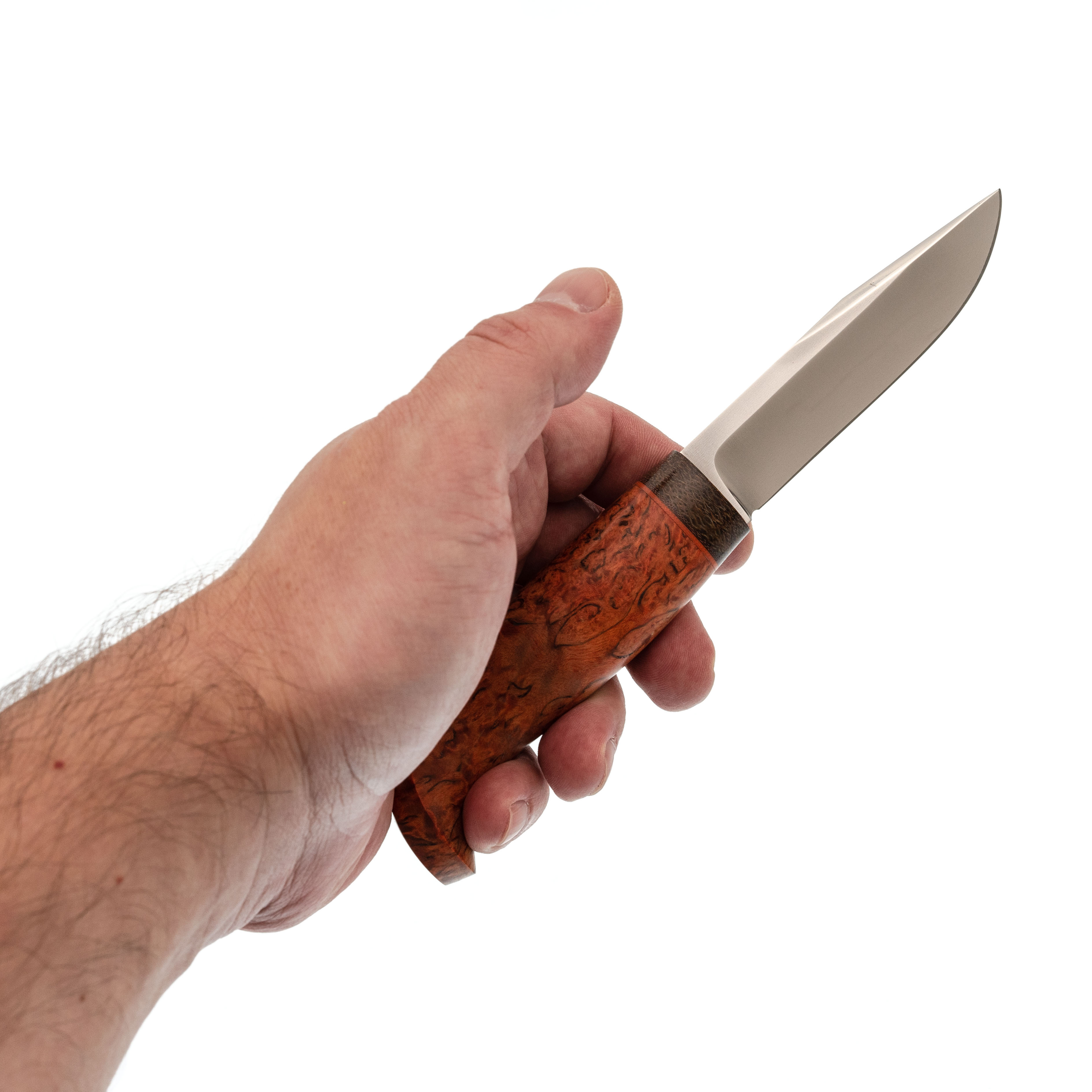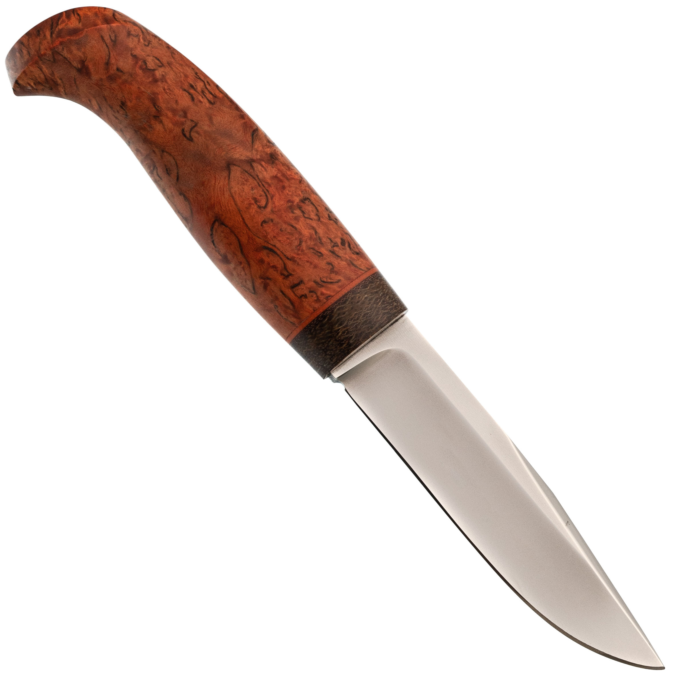 Эргономичная форма с характерным финским грибком заполняет ладонь и не даёт проворачиваться. Карельская берёза добавляет комфорт в любую погоду, а сквозной монтаж придаёт уверенность при длительной работе.