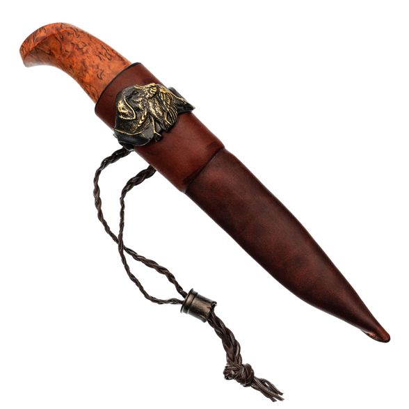 Премиальная кожа растительного дубления формуется под конкретный экземпляр, поэтому клинок сидит плотно и не выскакивает. Литая деталь с изображением собаки добавляет индивидуальности. Кожаный шнур позволяет менять глубину подвеса по своему вкусу - удобно на поясе, рюкзаке или разгрузке.
