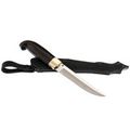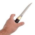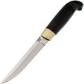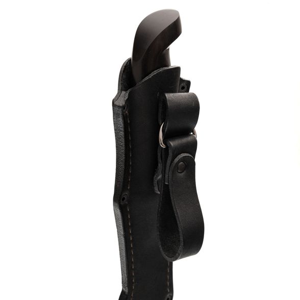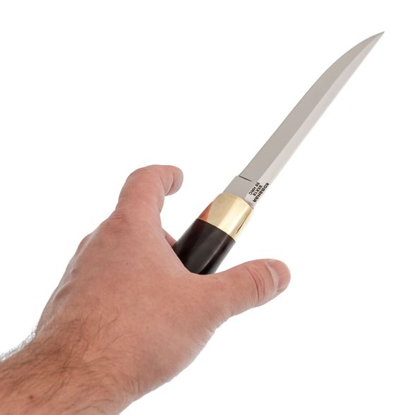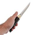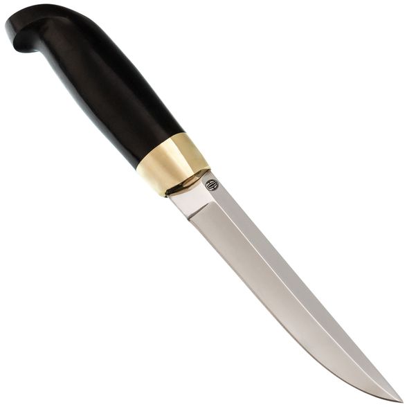 Рукоять ножа удобно лежать в руке и позволяет использовать различные типы хватов: прямой, обратный и финский. В комплекте с ножом идут удобные ножны погружного типа.