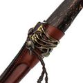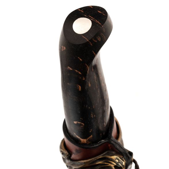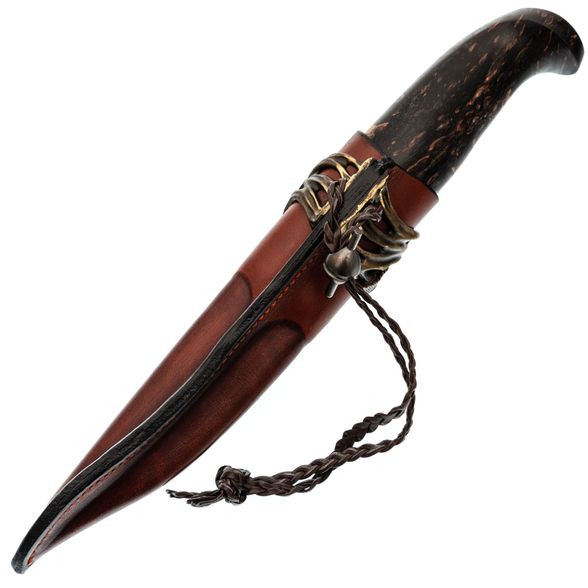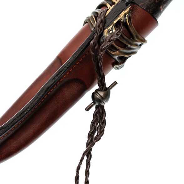 Каждые ножны подгоняются под свой экземпляр вручную. Кожа растительного дубления - плотная и надёжная, с красивой текстурой. Украшения в виде карпа придают индивидуальность, а подвес на кожаном шнуре позволяет регулировать посадку. Небольшая бусина-поплавок завершает образ - простая, но выразительная деталь для ценителей.