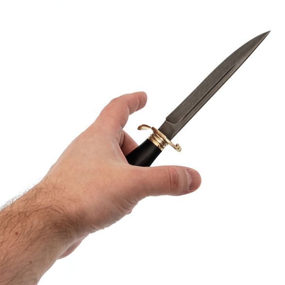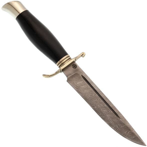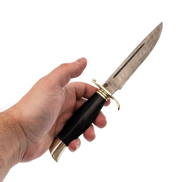 Клинок ножа изготовлен из дамасской стали, известной своей многослойной структурой, обеспечивающей высокую твердость и прочность. Благодаря микропиле на режущей кромке, образующейся из-за сваренных слоев, нож обладает агрессивным резом и долго сохраняет остроту. Однако стоит учитывать, что дамасская сталь подвержена коррозии и требует регулярного ухода: после использования рекомендуется промывать, вытирать насухо и смазывать техническим маслом. Высокие спуски клинка способствуют отличным режущим и строгальным характеристикам.