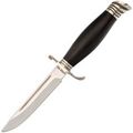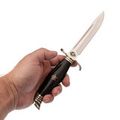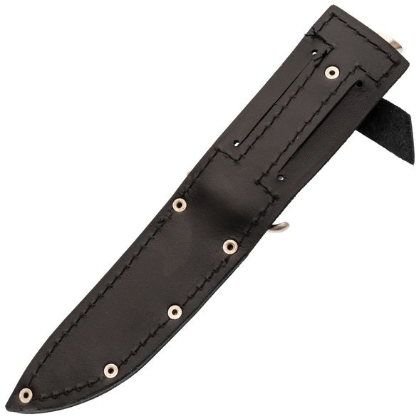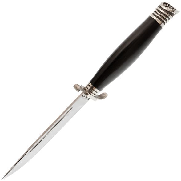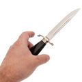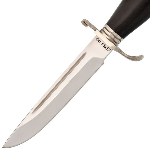Рукоять ножа отличается характерным дизайном с развитой гардой, защищающей пальцы, и навершием в виде грибка. Основная часть рукояти изготовлена из древесины граба, которая обеспечивает надежный и комфортный хват. Граб обладает высокой прочностью и не холодит руку, делая использование ножа комфортным даже в холодных условиях.