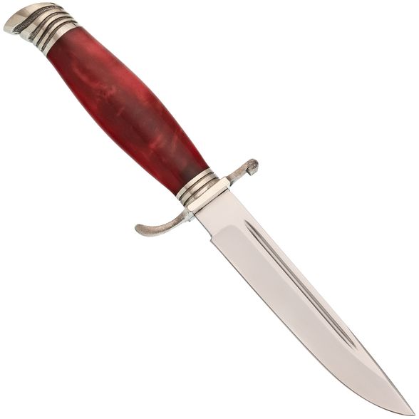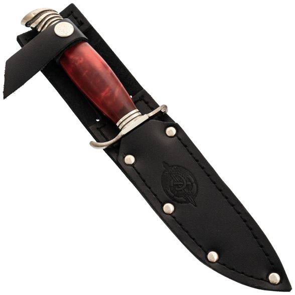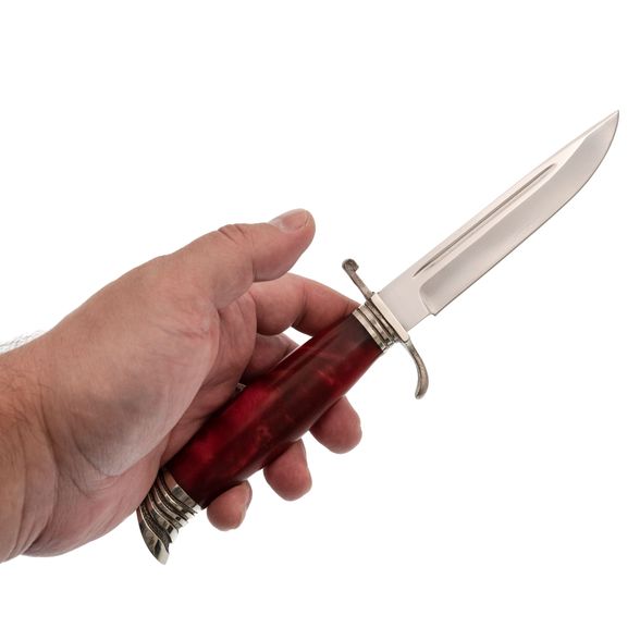 Рукоять Антареса имеет уникальную форму, характерную для ножей того периода. Гарда из мельхиора придает ножу узнаваемый вид и обеспечивает защиту пальцев. Сама рукоять выполнена из акрила - прочного и легкого в уходе полимерного материала.