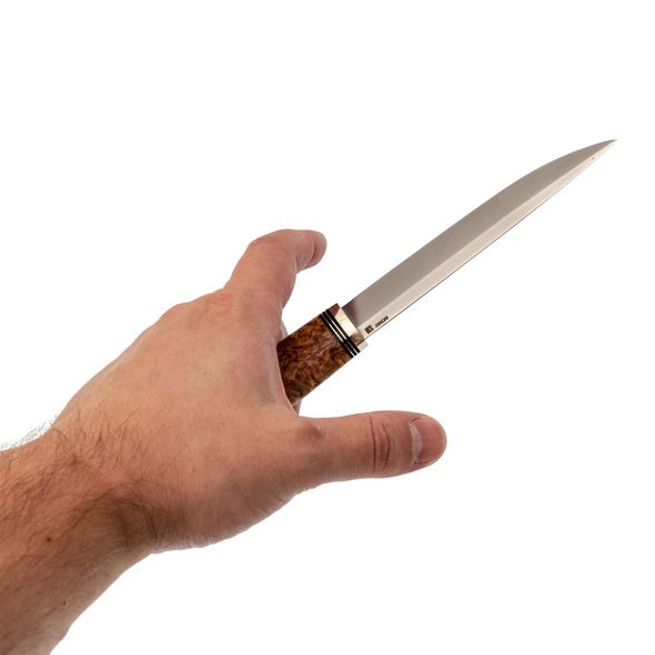 Объёмная бочкообразная форма удобно ложится в ладонь, не крутится при поворотах кисти и длительной работе. Карельская берёза добавляет контролируемого трения и приятного ощущения живого материала. Сквозной монтаж - дополнительный запас прочности.