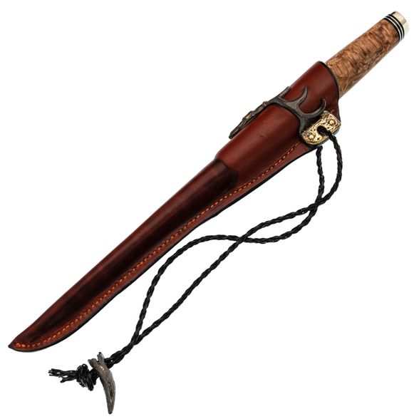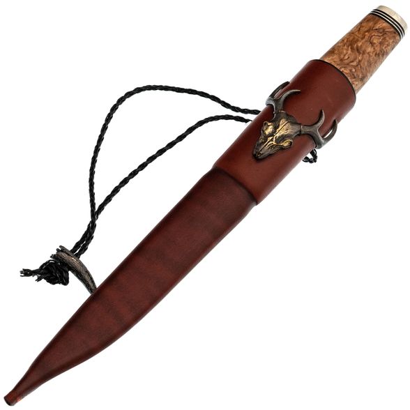 Индивидуально формованные ножны из кожи растительного дубления надёжно удерживают модель. Литая вставка с черепом оленя с рогами придаёт характер, а кожаный шнур подвеса помогает настраивать глубину ношения под одежду и привычки владельца.
