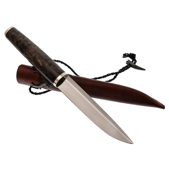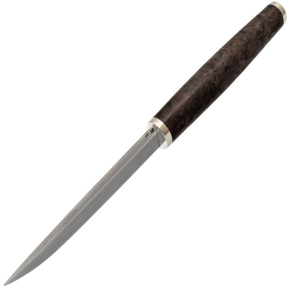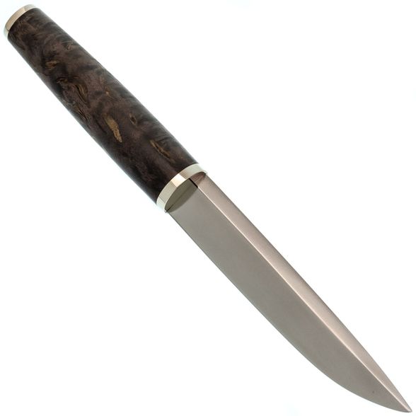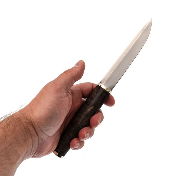 Рукоять ножа изготовлена из стабилизированной карельской берёзы - древесины, известной своей прочностью, водоотталкивающими свойствами и характерной природной текстурой. Материал стабилизирован, что делает его устойчивым к влаге, перепадам температур и механическим нагрузкам.