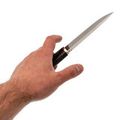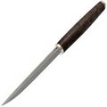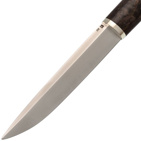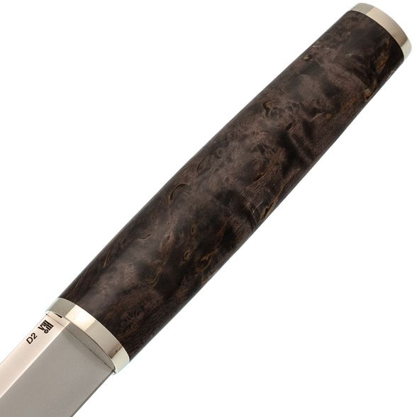 Клинок ножа выполнен из стали D2 - материала, известного своей твёрдостью, отличным удержанием режущей кромки и устойчивостью к износу. Ромбовидное сечение с высокими прямыми спусками обеспечивает отличные резательные и строгательные свойства. Такая геометрия универсальна - нож легко справляется с разделкой рыбы, приготовлением пищи и обработкой древесины.