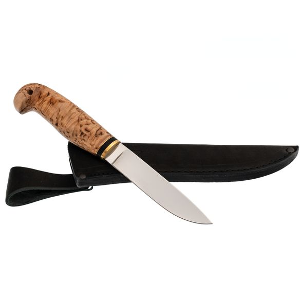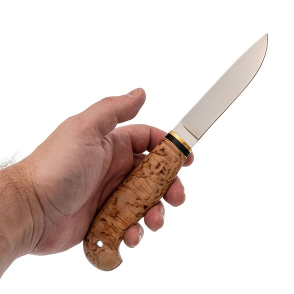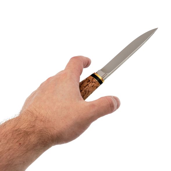 Рукоять Ножа Финский-2 выполнена из карельской березы — материала, который ценится за красоту и прочность. Каждая рукоять изготавливается литьем, что придает ножу индивидуальность. В сочетании с качественной сталью, рукоять обеспечивает плотный хват и комфорт при использовании.
