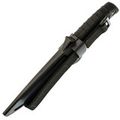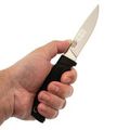 оснащен эластроновой рукоятью, которая обеспечивает удобный и безопасный хват. Рукоять имеет небольшой ограничитель и удобное выступающее рифление, предотвращая скольжение и обеспечивая уверенное удержание ножа в руке. На рукояти также имеется темлячное отверстие, оснащенное стальной трубкой для дополнительной прочности.