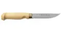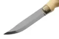 Рукоять из карельской берёзы имеет удобный профиль, который хорошо заполняет ладонь, несмотря на компактный размер ножа. Фирменный «грибок» финских ножей на тыльнике добавляет контроля и даёт дополнительную опору при работе разными хватами. Сквозной монтаж увеличивает общую прочность конструкции, позволяя не переживать за нож при регулярном использовании в походах и на рыбалке.