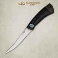 Малый филейный нож с узким клинком для разделки рыбы. Клинок толщиной 2 мм имеет линзовидные спуски, образующие тонкое, прекрасно режущее лезвие. Рукоять эргономической формы уверенно и прочно лежит в любой ладони. А оптимальной величины гарда не дает соскользнуть пальцам при резах от себя. Монтаж клинка сквозной, неразборный. Отличный выбор для разделки рыбы.