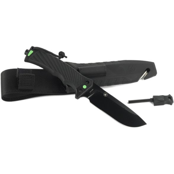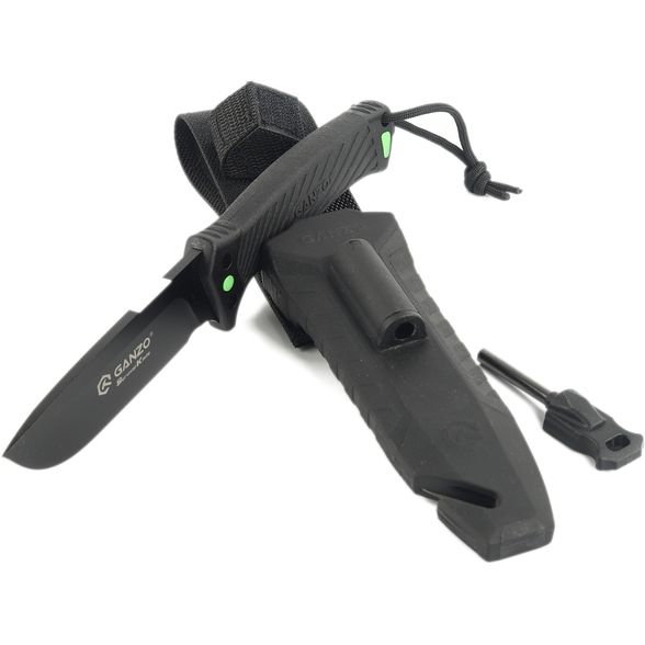 Нож Ganzo G8012V2 -BK c паракордом, сталь 8CR13 - клинок изготовлен из нержавеющей стали 440 и имеет черное покрытие для предотвращения царапин на стали. Профиль drop point и толщина 5 мм делают нож пригодным для более тяжелых работ. На тыльной стороне лезвия имеется специальная область для высекания искр. Рукоятка ножа изготовлена из пластика. Рукоятка прорезинена, что значительно повышает безопасность использования инструмента. На конце рукоятки имеется отверстие для страховочной веревки и стеклобоя. Для снятия рукоятки необходимо открутить молоток. Магниевый держатель, а также алмазный камень и съемное безопасное лезвие установлены в кейсе. Корпус кейса изготовлен из пластика. Чехол изготовлен из материала Cordura.