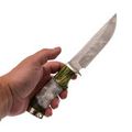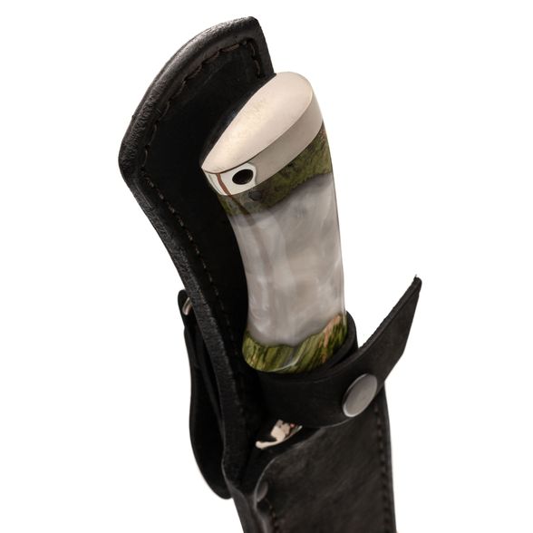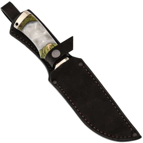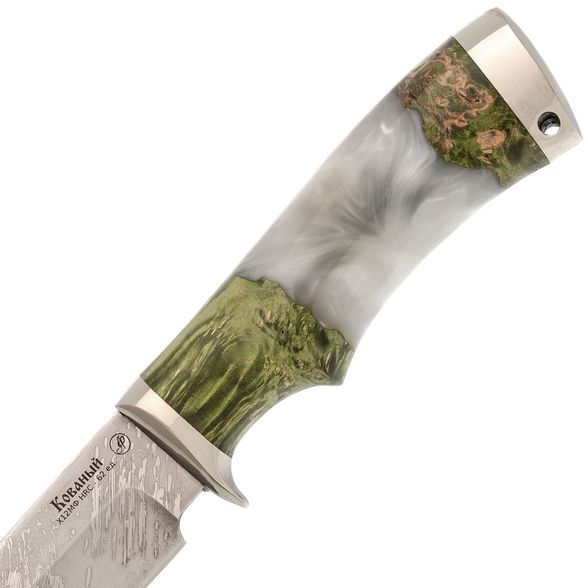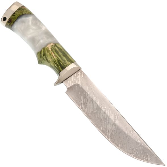 Рукоять - это сочетание красоты и практичности. Использованы такие материалы, как стабилизированная карельская берёза, акрил и мельхиор, обеспечивающие надежность и устойчивость к воздействию окружающей среды. Рукоять имеет объемную форму с плавным изгибом, что гарантирует отличное и безопасное удержание ножа в руке. Такое исполнение позволяет уверенно работать с ножом в любых условиях.