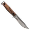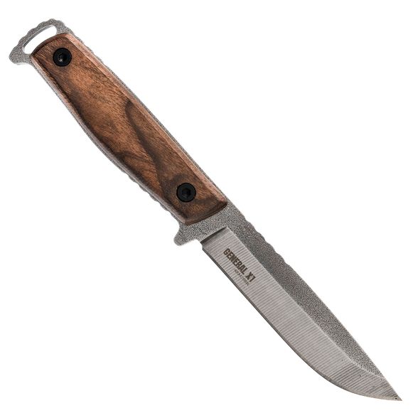 В наличии представлен цельный нож, состоящий из единой стальной заготовки, переходящей от клинка в рукоять. Для производства был использован булат – высококачественная нержавеющая сталь марки 420HC. Аксессуар состоит из лезвия с профилем Drop Point, которое дополнительно обработано и покрыто защитным материалом по технологии Stonewash. Использованная марка стали 420HC отличается высокой твердостью, равной 56-58 HRC. Это говорит о том, что ножу будет требоваться меньшее количество заточек.