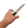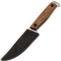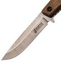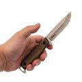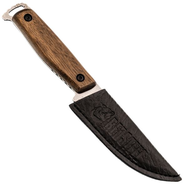 Рукоять ножа имеет накладной монтаж, что обеспечивает надёжность и долговечность конструкции. Накладки выполнены из древесины ореха, которая известна своей твёрдостью и устойчивостью к воздействию окружающей среды. Рукоять имеет достаточный объём и эргономичную форму, что позволяет комфортно работать с ножом. На конце рукояти расположен выступ, который можно использовать как молоток для легких ударов.