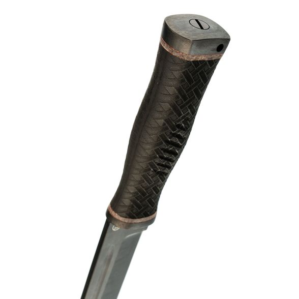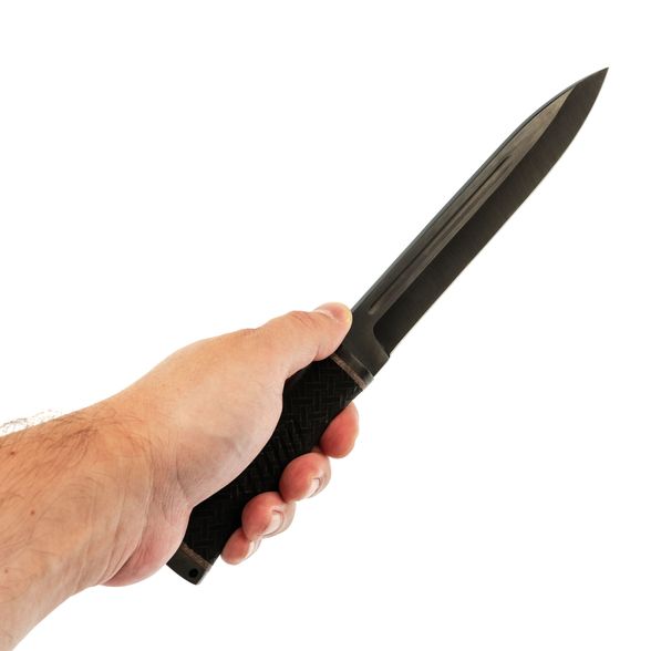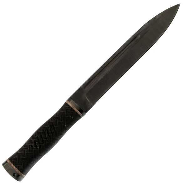 Клинок ножа выполнен из углеродистой рессорной стали 65Г с воронением. Это обеспечивает отличную стойкость к износу и коррозии, а также позволяет ножу сохранять остроту даже при интенсивном использовании. Воронение клинка не только придает ему стильный черный матовый оттенок, но и предотвращает появление бликов, что особенно важно при использовании ножа на охоте или в условиях, где скрытность является важным фактором. Толщина клинка оптимальна для выполнения различных задач, от резки до более сложных операций, таких как разделка дичи или работы с твердыми материалами.