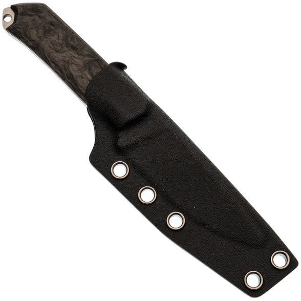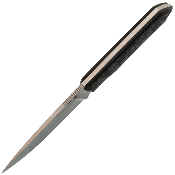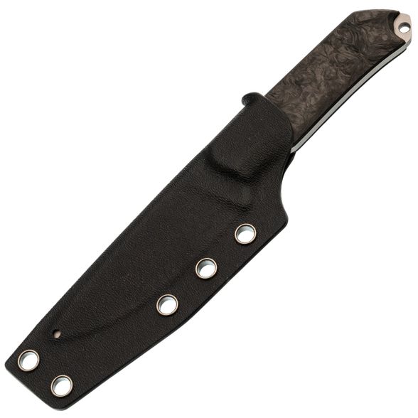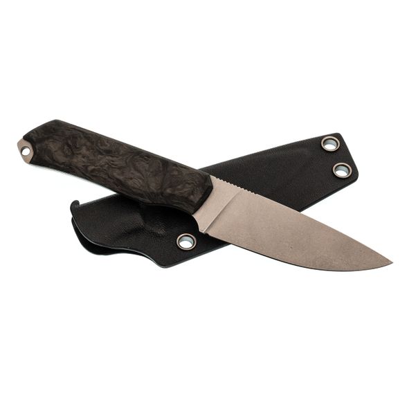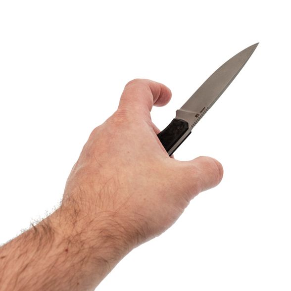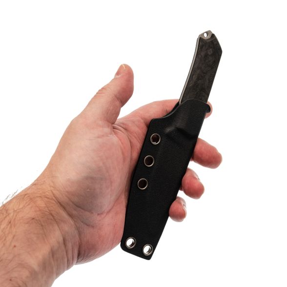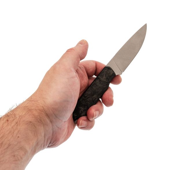 - Карбон на рукояти. Накладки из карбона делают нож очень лёгким и приятным на ощупь. Этот материал не боится перепадов температур, выглядит аккуратно и современно, а его структура даёт нужное сцепление с ладонью без излишней агрессивности.