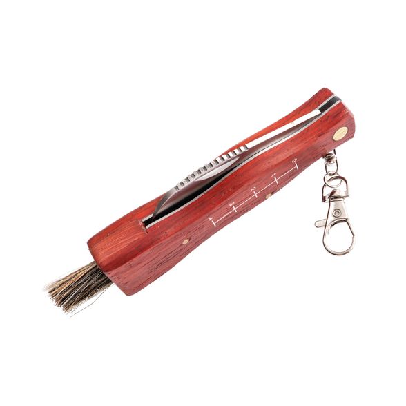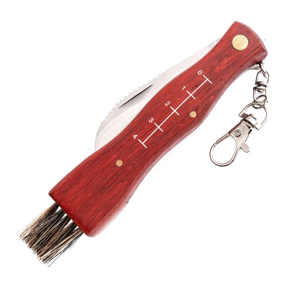 Рукоять из прочной древесины гарантирует надежный хват и устойчивость к износу, что особенно важно при длительных походах. Металлические заклепки обеспечивают прочное соединение рукояти с корпусом ножа. Встроенная линейка на рукояти - отличное дополнение для определения размеров грибов, что может быть полезно при соблюдении правил сбора или для личных записей. Щетка для очистки грибов на основании ножа - еще одна удобная особенность, позволяющая быстро очистить собранные трофеи от грязи и мусора.