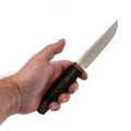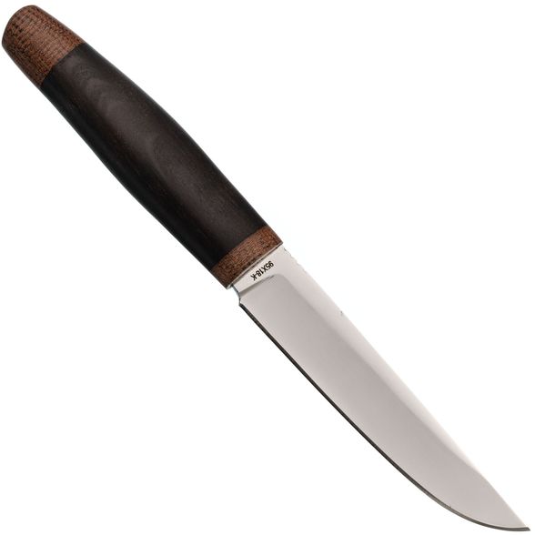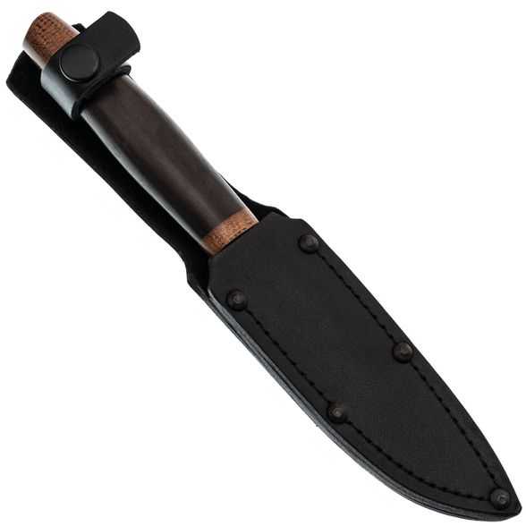 Туристический нож Гюрза-3 это отличный вариант ножа для пикников или несложных походов. Длинный клинок из нержавеющей стали 95х18 хорошо справляется не только с нарезкой мяса, приготовлением салатов и шинковкой зелени, но и со строганием, раскалыванием небольших поленьев или какими-то боковым нагрузкам в разумных пределах. Спуски от середины обеспечивают ножу такую универсальность. Рукоять ножа удобно ложится в мужскую и женскую руку благодаря бочкообразной рукояти из граба. Сквозной монтаж клинка не только облегчает, но и не позволяет хвостовику холодить руку. Для перевозки в автомобиле или ношения на поясе используются удобные кожаные ножны.