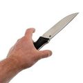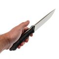 Рукоять имеет пистолетный изгиб, благодаря чему удобно и надежно лежит в руке. Накладки из стеклотекстолита G10 делают рукоять устойчивой к любым нагрузкам и гарантируют надежный хват, а их большая толщина обеспечивает комфортное и безопасное использование. Рукоять также оснащена темлячным отверстием, а накладки можно снять для чистки.