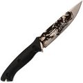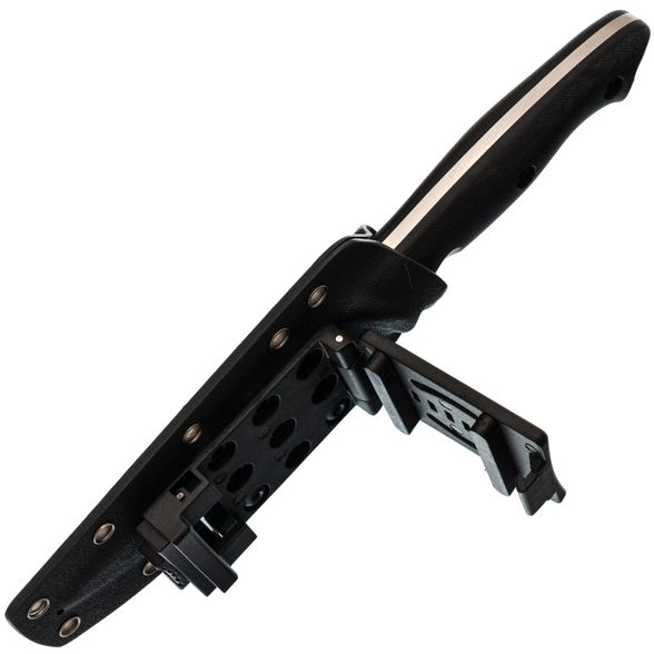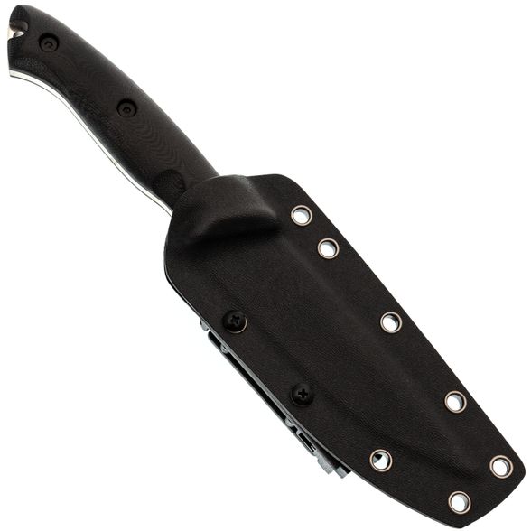 Рукоять с плавным изгибом и толстыми скруглёнными накладками отлично заполняет ладонь. Цепкая фрезеровка помогает удерживать нож без напряжения, даже при долгой работе. Есть темлячное отверстие для тех, кто любит дополнительную фиксацию. Ножны из Kydex комплектуются креплением Tek Lok - можно носить на ремне так, как удобнее: вертикально или горизонтально.