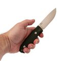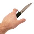 Дизайнеры OWL Knife не стали делать рукоять агрессивной или вычурной. Форма простая, но эргономичная: она хорошо ложится в ладонь, но при этом не заставляет держать нож единственно возможным способом. Можно взять его и обычным хватом, и молотковым для силовых работ. На рукояти есть характерная для OWL выемка у самой пяты клинка. Это не элемент дизайна, а рабочий момент: так удобно перехватывать нож щипковым хватом, как поварской нож, когда нужен особый контроль над кончиком. Накладки имеют чёткий, но не царапающий руку рельеф - даже мокрые пальцы не соскальзывают. Монтаж сквозной, хвостовик закрыт, так что зимой руки к металлу не примерзнут.